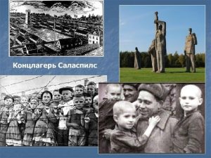 Post Scriptum. Раньше не принято было предавать огласке, что полицейскими охранниками лагеря выступали добровольцы из среды самих осужденных, в частности полицаями были евреи и представители других национальностей и народностей. Они измывались над узниками и детьми Саласпилса не меньше нацистов. Об одном таком эпизоде в советское время был снят художественный фильм «Совесть».